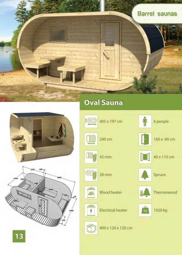 Le pareti da 40 mm offrono un isolamento termico efficace, mantenendo il calore all’interno in maniera stabile e piacevole. Con un peso di 1250 kg, la struttura risulta solida e ben ancorata. L’altezza compresa tra 220 e 250 cm garantisce libertà di movimento e comfort.